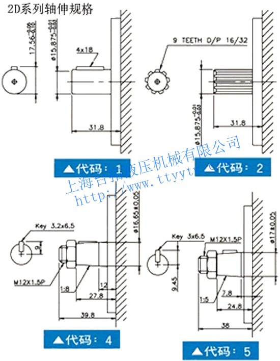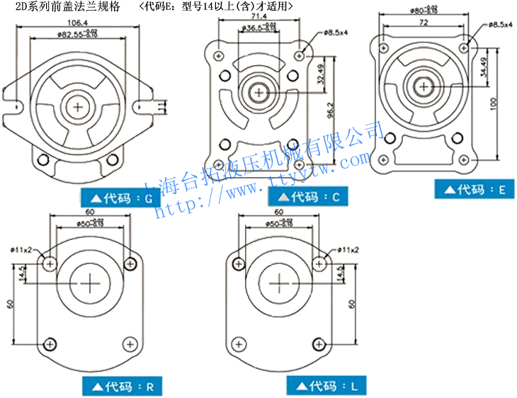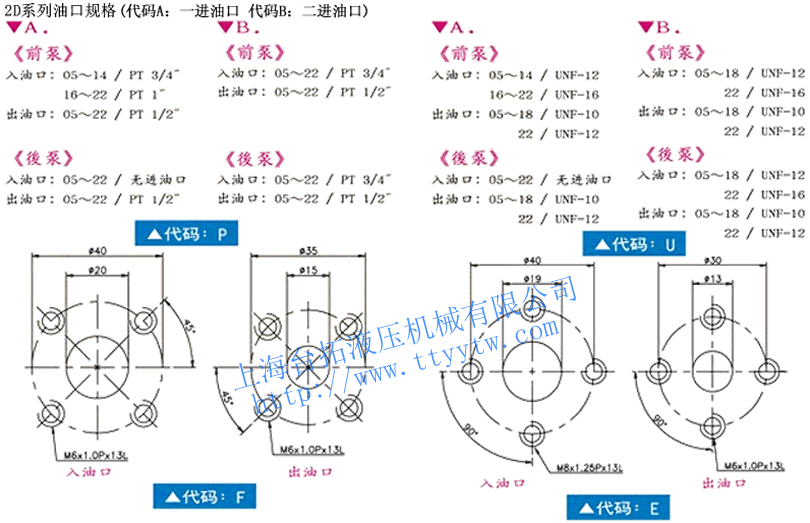 2 D G 1 B P 16 14 R 系列 型式/功能 前蓋法蘭規格 軸伸規格 2進油口數 出入油口規格 前泵排量 后泵排量 旋向(R,L) 備注:1、R表示右轉,面向軸伸順時針;L表示左轉,面向軸伸逆時針。2、假設您選前蓋法蘭為G,軸伸代碼為1,二進油口代碼為B,出入油口規格代碼為P,選用排量是16&14ml/r,旋向是右旋,正確的訂購型號:2DG1BP1614R。