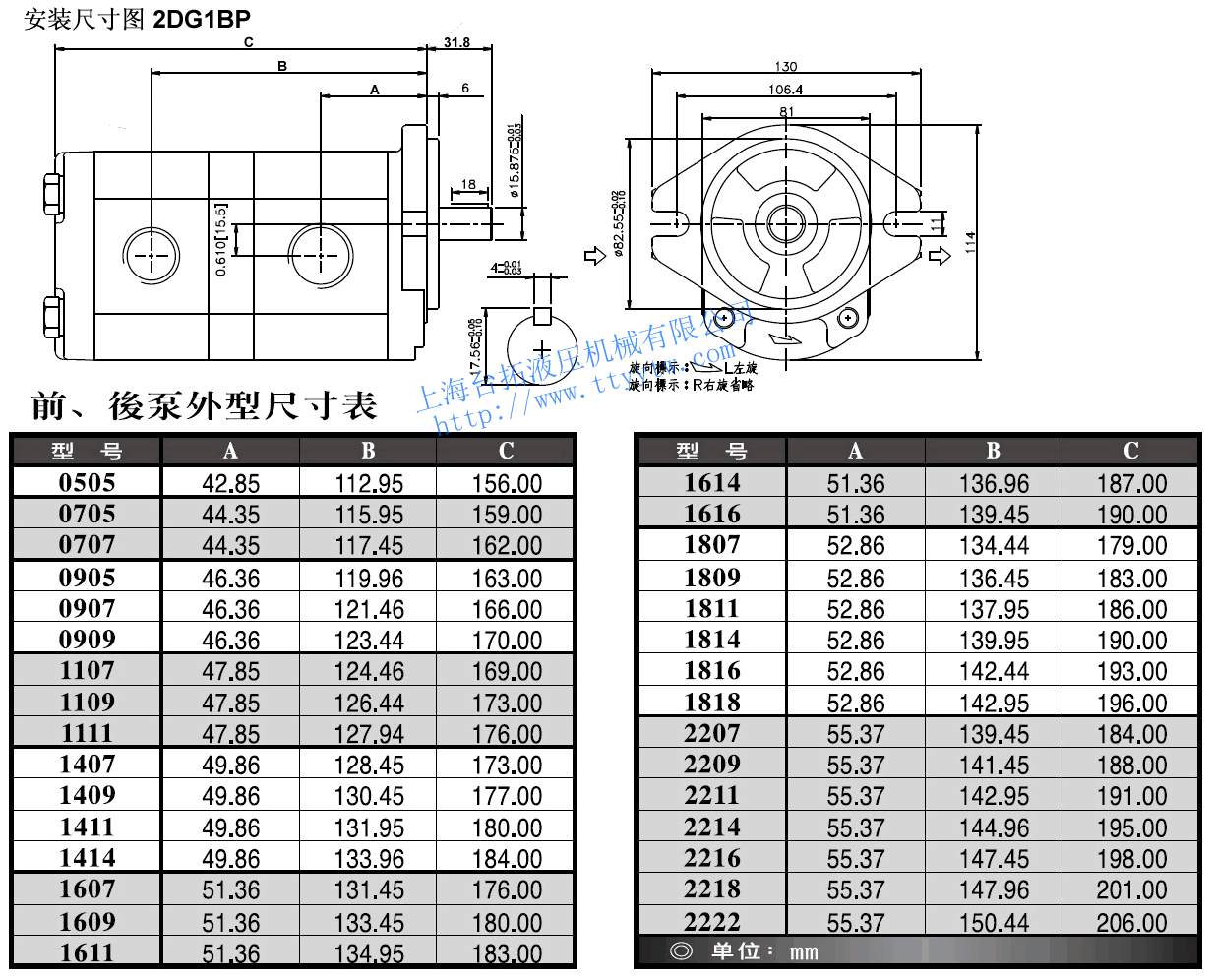 kg前泵 后泵 前泵 后泵 前泵 后泵 前泵 后泵L 2DG1BP0505 5.0 5.0 21 3500 PT1/2" PT1/2" PT3/4" 無 PT3/4" PT3/4" 10.27 2DG1BP0705 7.0 5.0 10.44 2DG1BP0707 7.0 10.60 2DG1BP0905 9.5 5.0 10.58 2DG1BP0907 7.0 10.85 2DG1BP0909 9.5 11.06 2DG1BP1107 11.3 7.0 11.03 2DG1BP1109 9.5 11.24 2DG1BP1111 11.3 11.39 2DG1BP1407 14.0 7.0 11.23 2DG1BP1409 9.5 11.45 2DG1BP1411 11.3 11.60 2DG1BP1414 14.0 11.79 2DG1BP1607 16.0 7.0 PT 1" 11.44 2DG1BP1609 9.5 11.64 2DG1BP1611 11.3 11.80 2DG1BP1614 14.0 11.99 2DG1BP1616 16.0 12.16 2DG1BP1807 18.0 7.0 18 11.63 2DG1BP1809 9.5 11.84 2DG1BP1811 11.3 12.00 2DG1BP1814 14.0 12.18 2DG1BP1816 16.0 12.36 2DG1BP1818 18.0 12.56 2DG1BP2207 21.5 7.0 11.90 2DG1BP2209 9.5 12.11 2DG1BP2211 11.3 12.26 2DG1BP2214 14.0 12.45 2DG1BP2216 16.0 12.62 2DG1BP2218 18.0 12.84 2DG1BP2222 21.5 13.11 高壓雙聯齒輪泵2DG1BP尺寸圖
