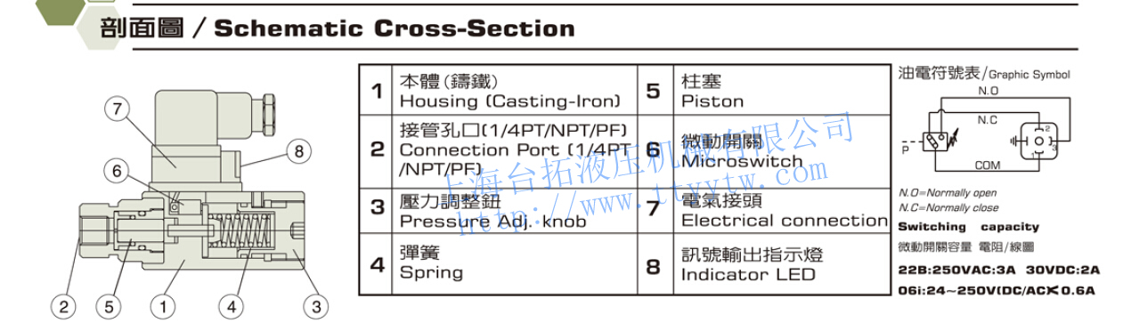 壓力繼電器DNB一般型,接管口徑:1/4" PT(PF,NPT)內(nèi)牙,負(fù)載:5A-125,250VAC,LOAD:5A,30VDC,0.15A,125VDC。