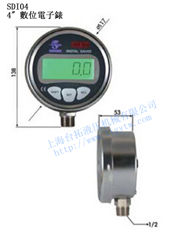 1、數位接點式壓力表SDI04,背光顯示,歸零設定,單位切換8種Si,Bar,kg/cm2,Kpa,Mpa,inHg,cmHg,Atm,感測器SUS316一體成型,防漏。