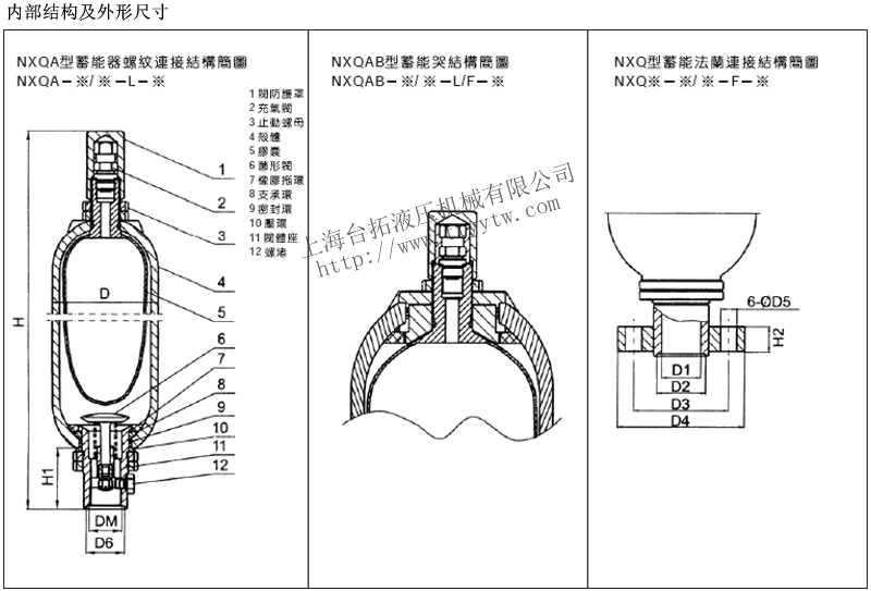 31.50.25 260 M22×1.5 30 56 2 NXQ-0.4/*-L/F-* 0.4 250 M27×2 52 89 3 NXQ-0.63/*-L/F-* 0.63 320 M27×2 52 89 3.5 NXQ-01/*-L/F-* 1 315 M27×2 52 114 5.5 NXQ-1.6/*-L/F-* 1.6 355 370 M42×2 42 50 97 130 17 50 66 25 152 12.5 NXQ-2.5/*-L/F-* 2.5 420 435 M42×2 42 50 97 130 17 50 66 25 152 15 NXQ-4/*-L/F-* 4 530 545 M42×2 42 50 97 130 17 50 66 25 152 18.5 NXQ-6.3/*-L/F-* 6.3 700 715 M42×2 42 50 97 130 17 50 66 25 152 25.5 NXQ-10/*-L/F-* 10 660 685 M60×2 55 695 125 160 21 70 85 32 219 48 NXQ-16/*-L/F-* 16 870 895 M60×2 55 695 125 160 21 70 85 32 219 63 NXQ-25/*-L/F-* 25 1170 1195 M60×2 55 695 125 160 21 70 85 32 219 84 NXQ-40/*-L/F-* 40 1690 1715 M60×2 55 695 125 160 21 70 85 32 219 119 NXQ-20/*-L/F-* 20 690 715 M72×2 70 80 150 200 26 80 105 40 299 92 NXQ-25/*-L/F-* 25 780 805 M72×2 70 80 150 200 26 80 105 40 299 105 NXQ-40/*-L/F-* 40 1080 1110 M72×2 70 80 150 200 26 80 105 40 299 135 NXQ-63/*-L/F-* 63 1500 1530 M72×2 70 80 150 200 26 80 105 40 299 191 NXQ-80/*-L/F-* 80 1810 1840 M72×2 70 80 150 200 26 80 105 40 299 241 NXQ-100/*-L/F-* 100 2220 2250 M72×2 70 80 150 200 26 80 105 40 299 290 備注:1、公稱壓力:10、20,31.5Mpa;適用介質:礦物油水-乙二醇、乳化液;介質溫度-10度~+70度。2、1Mpa=10bar=10.2kgf/cm2。