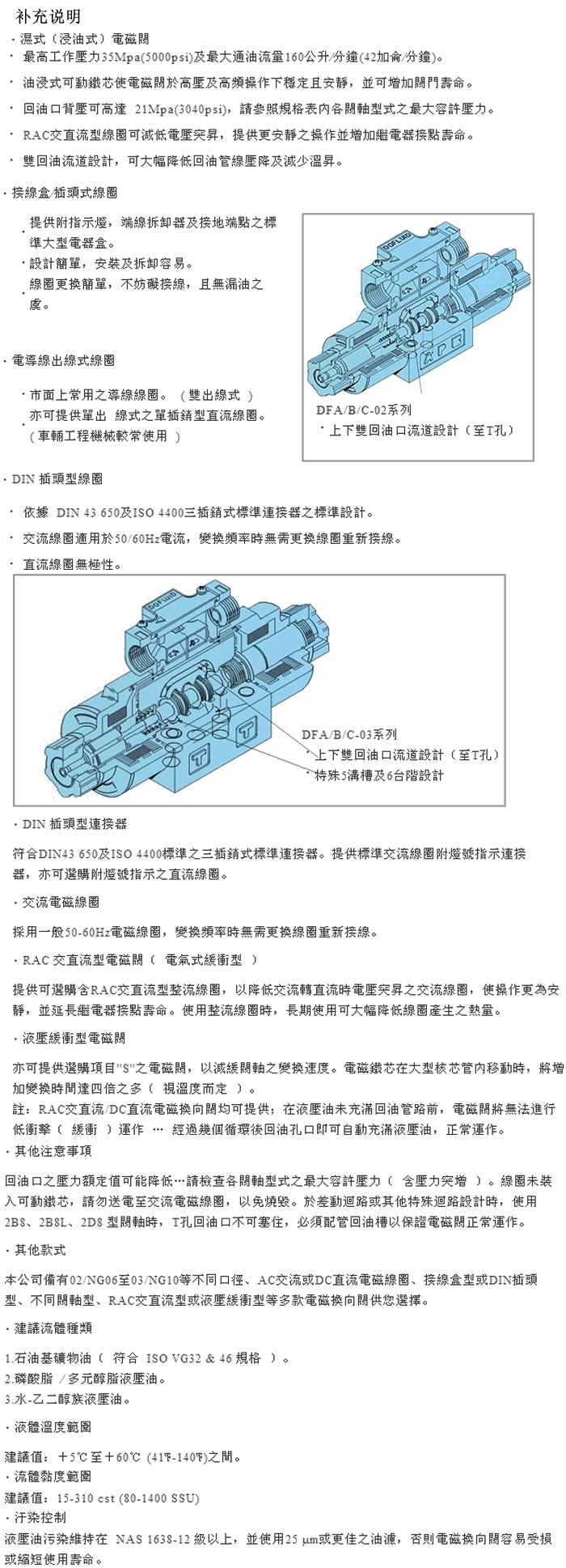 DFA/B/C-02 DFA/B/C-03 交流電磁閥 直流電磁閥 交流電磁閥 直流電磁閥 內附整流器 - 內附整流器 - 交流 RAC 直流 交流 RAC 直流 最高工作壓力 P,A,B孔口 35Mpa 最大回油容許背壓 T孔口 35:21Mpa