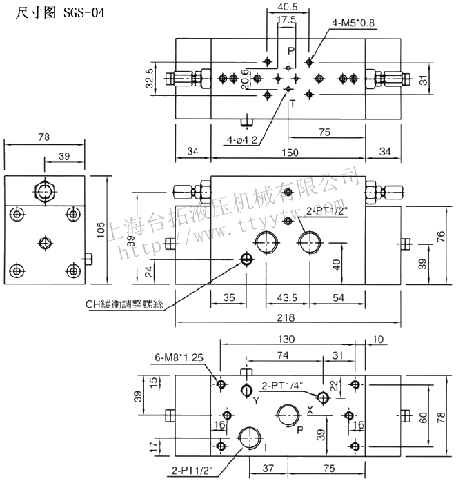 型號 最大流量?/min 最大壓力MPa 口徑 臺面 SGS-04 30 4 PT 1/2 " 300×600 電磁式引導(dǎo)方向閥SGS-04尺寸圖