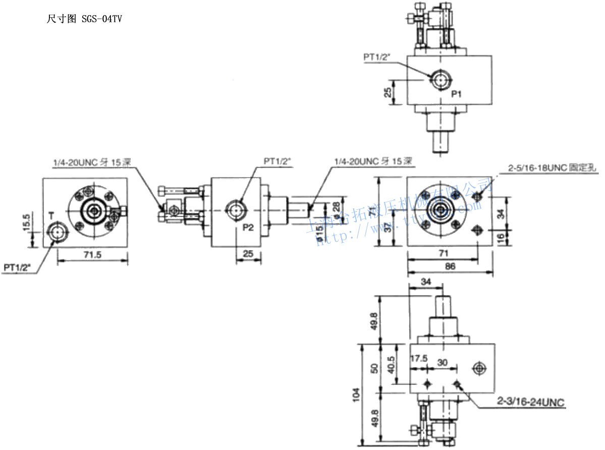 型號 最大流量?/min 最大壓力MPa 口徑 SGS-04TV 30 4 PT 1/2 " 一位式流量控制閥SGS-04TV尺寸圖