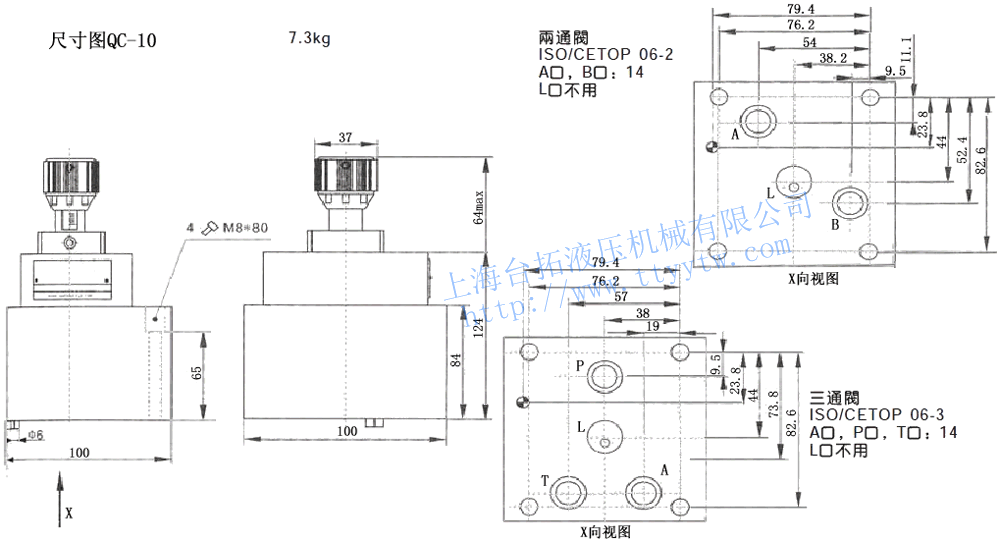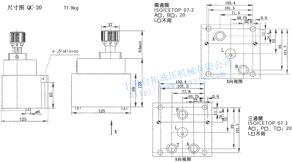 閥型號 QC-10/2 QC-10/2/V QC-10/3 QC-20/2 QC-20/2/V QC-20/3 最大設定流量(?/min) 60 130 160 180 最小設定流量(?/min) 120 120 單項閥B→A最大流量(?/min) 80 - - 160 - - 調節壓差△P(MPa) ≥0.6 0.6 0.5 ≥0.7 0.8 P口最大流量(?/min) - - 60 - - 180 最大壓力(MPa) 25 25 壓力補償型流量控制閥QC-10,20尺寸圖