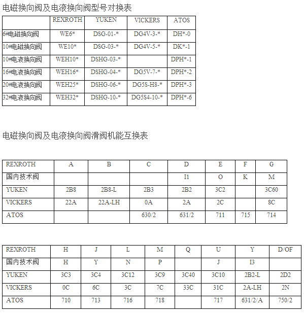電磁換向閥型號(hào)對照表(力士樂、YUKEN、VIKERS、ATOS)