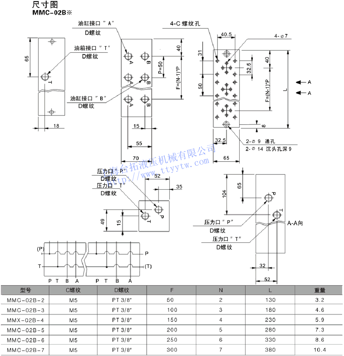 備注:1、標準型油路塊MMC,最高使用壓力:30MPa,最大流量: 02:40?/min   03:80?/min。2、標準型油路塊MMC,A、B出入油口位置: 標準規格為B口在上。3、標準型油路塊MMC,油口螺紋標準為PT,NPT及BSP。