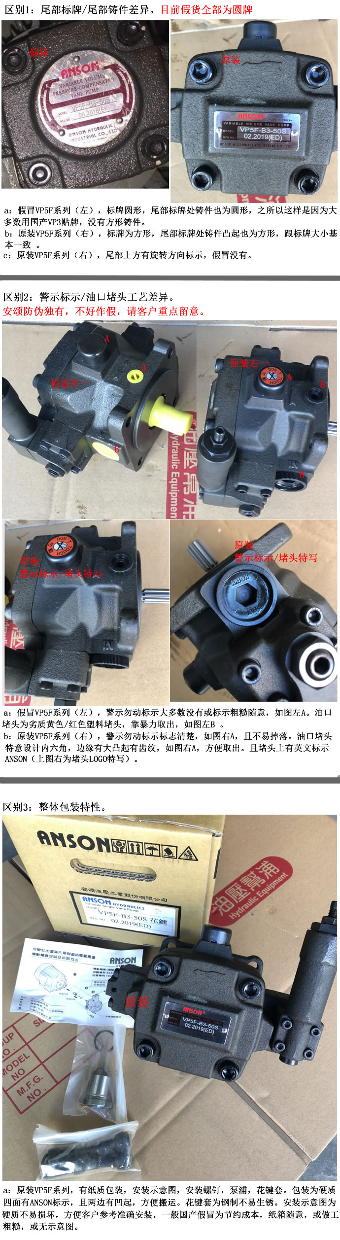 上海臺拓液壓機械有限公司為安頌液壓工業股份有限公司授權代理商,鑒于最近幾年安頌泵浦熱銷,與此同時假冒偽劣產品也越來越多,本著維護安頌ANSON品牌、客戶權益角度,現整理真假安頌產品特征請留意。