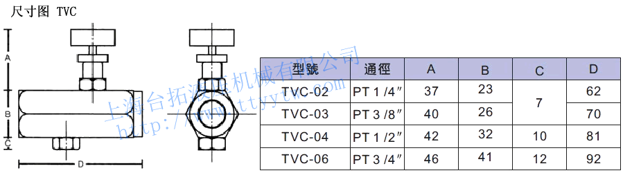 型號 最高使用壓力MPa 定格流量?/min 口徑 材質 重量Kg TVC-02 25 12 PT 1/4" 六角鋼 0.3 TVC-03 20 PT 3/8" 0.3 TVC-04 30 30 PT 1/2" 0.5 TVC-06 48 PT 3/4" 0.8 TVL-03 7 25 PT 3/8" 四角銅 0.3 TVH-03 25 25 PT 3/8" 四角銅 0.5 TVH-04 30 35 PT 1/2" 六角鋼 0.8 備注:1、TVL:高敏度適用于風油從東機構,金屬圓鋸大量采用。2、TVH:高回油量(比傳統單向節流閥高1.7倍).以進油方式控制能縮短。3、TVC:同心度高微調精準,以回油控制為最佳方式。