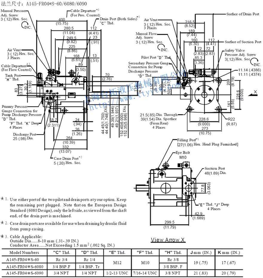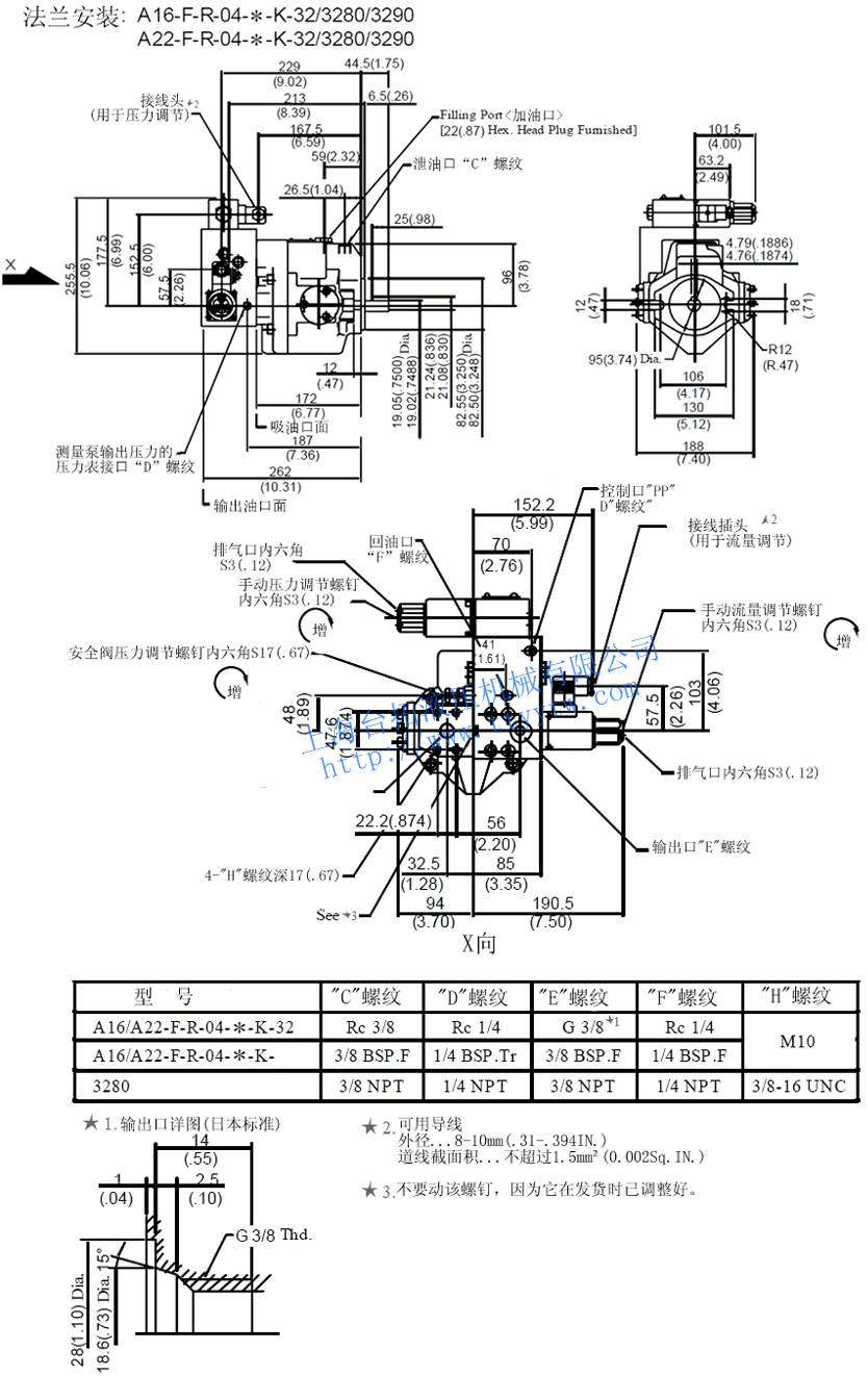 泵型號(hào) 接口名稱(chēng) 管道法蘭組件號(hào) 螺紋連接 管道焊接★1 日本標(biāo)準(zhǔn) 歐洲標(biāo)準(zhǔn) 美國(guó)標(biāo)準(zhǔn) 日本標(biāo)準(zhǔn) 美國(guó)標(biāo)準(zhǔn) A16-*-R-04 吸入口 F5-06-A-10 F5-06-A-1080 F5-06-A-1090 F5-06-B-10 F5-06-B-1090 A22-*-R-04 出油口 —★1 —★1 —★1 —★1 —★1 A37-*-R-04 吸入口 F5-10-A-10 F5-10-A-1080 F5-10-A-1090 F5-10-B-10 F5-10-A-1090 A45-*-R-04 出油口 F5-06-A-10 F5-06-A-1080 F5-06-A-1090 F5-06-B-10 F5-06-A-1090 A56-*-R-04 吸入口 F5-12-A-10 F5-12-A-1080 F5-12-A-1090 F5-12-A-10 F5-12-A-1090 A70-*-R-04 出油口 F5-10-A-10 F5-10-A-1080 F5-10-A-1090 F5-10-A-10 F5-10-A-1090 A90-*-R-04 吸入口 F5-16-A-10 F5-16-A-1080 F5-16-A-1090 F5-16-A-10 F5-16-A-1090 A145-*-R-04 出油口 F5-10-A-10 F5-10-A-1080 F5-10-A-1090 F5-10-A-10 F5-10-A-1090 備注:★1.比例變量柱塞泵型號(hào)A16,A22出油口只能用螺紋連接。